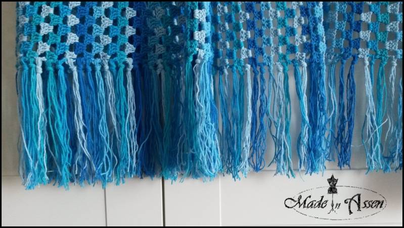 Je haakt twee lange gelijke delen (met de goede kant naar je toe) en laat er aan het begin en eind van elke toer 20 cm garen aan zitten. Deze werken we weg in de franjes dus ook de afwerking is simpel en lekker makkelijk.