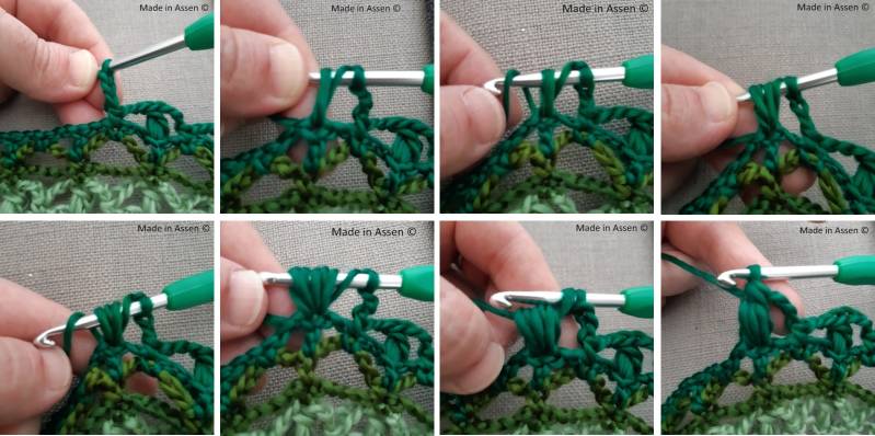 Haak het begin van 3 stokjes (of bij een puff omslaan en een lus ophalen 3x) maak de steek af op deze wijze