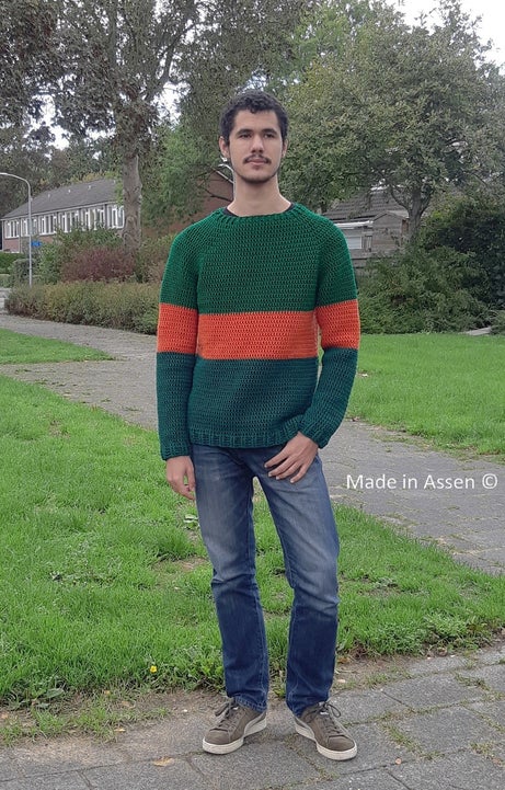 Hi Judit, bij de hoeken heb ik 5 steken tussen de vermeerderingen getekend in het diagram. Dat deed ik voor de trui van Matthew maar voor de trui van Bryan deed ik er in elke hoek 7 steken tussen.
