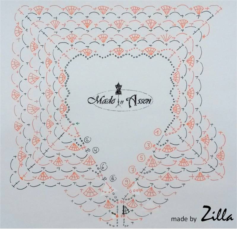 Bij mijn proefstukje heb ik AA 1 keer extra gehaakt. Je kunt spelen met AA, AZ,B en C wanneer je ander garen en/of naald gebruikt of wanneer je de hals kleiner of groter wilt. Maak het vestje zo lang of kort, zo strak of wijd als je wilt. DENK AAN UITHANGEN! het word met dragen iets langer houd daar rekening mee bij B+C