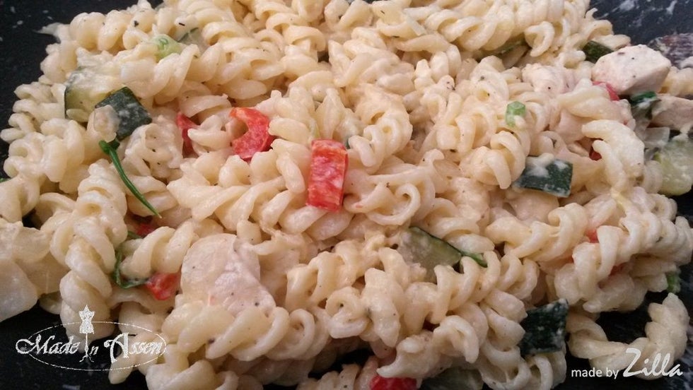 Romige Pasta met Ui Paprika Courgette Kip & Kaas
