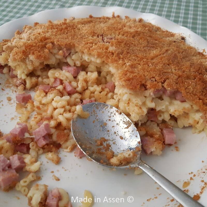 als de macaroni klaar is giet ik deze af en roer er 250gr ham blokjes door